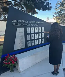 Albuquerque, NM (KKOB) —The Albuquerque Police Department today unveiled its new Fallen Officer Memorial at the APD Police Academy, honoring the ultimate sacrifice made by officers and K-9s who lost their lives in the line of duty. The ceremony took place one day after the 10-year anniversary of the line-of-duty death of Officer Daniel Webster, who was shot and killed in 2015 while conducting a traffic stop. Officer Webster’s service and sacrifice, along with that of all fallen officers, served as a solemn reminder of the risks faced by those who protect and serve the community every day. Mayor Tim Keller and APD Chief Harold Medina joined families of the fallen, department leadership, and fellow officers to pay tribute to the courage and commitment of those who dedicated their lives to safeguarding Albuquerque.