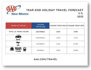 Albuquerque, NM — AAA New Mexico projects 8.9 million Mountain Region residents will travel at least 50 miles from home during the year-end holiday period, marking a 2.1% increase over last year. While slightly below the 2019 record, this year’s forecast surpasses 2024’s 8.7 million travelers.