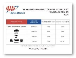 Albuquerque, NM — AAA New Mexico projects 8.9 million Mountain Region residents will travel at least 50 miles from home during the year-end holiday period, marking a 2.1% increase over last year. While slightly below the 2019 record, this year’s forecast surpasses 2024’s 8.7 million travelers.