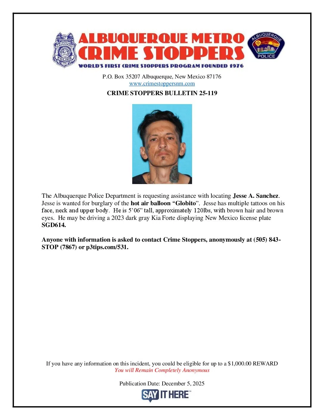 Albuquerque, NM (KKOB) --Albuquerque police have identified a suspect they say is responsible for stealing the "Patriot" globito from a Balloon fiesta warehouse on Thanksgiving. According to court documents an anonymous tipster recognized Jesse Sanchez from survei...